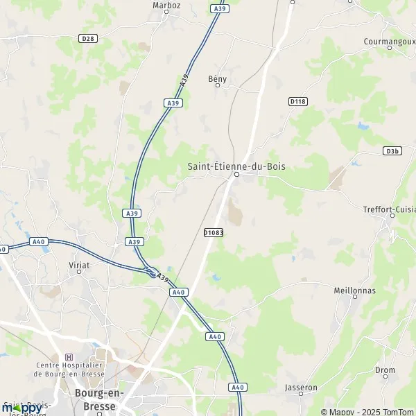 Géographie Localisation. Saint-Étienne-du-Bois est un bourg périurbain de la Bresse dans le département de l'Ain.. Les villes les plus proches sont Bourg-en-Bresse (10 km), Mâcon (50 km), Lons-le-Saunier (50 km), Lyon (89 km), Annecy (137 km) et Chambéry (126 km).. Communes limitrophes. Les communes limitrophes sont Bény, Courmangoux, Jasseron, Marboz, Meillonnas, Treffort-Cuisiat.