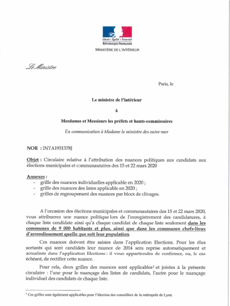 [DOCUMENT PUBLICSENAT.FR] Circulaire du ministère de l'Intérieur sur l'attribution de nuances