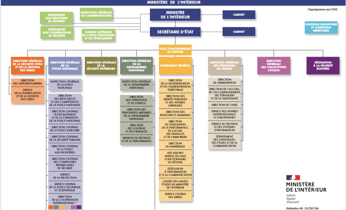 Le ministère de l'Intérieur et des Outre-mer comprend : Le secrétariat général SG. La direction générale des collectivités locales DGCL. La direction générale de la police nationale DGPN. La direction générale de la sécurité intérieure, service actif de la police nationale DGSI.