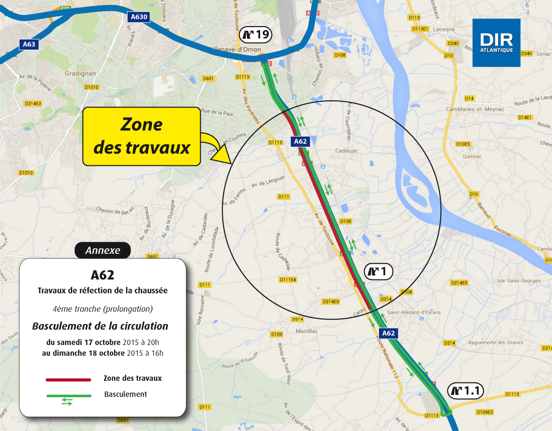 GIRONDE A62 Poursuite des travaux entre les échangeurs n°19 de la rocade (début A62) et n°1