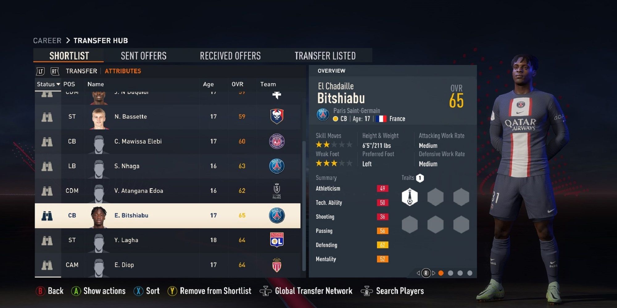 Based on FIFA 23 Feb 7, 2023. 64 66 Overall rating. 80 81 Potential. El Chadaille Bitshiabu (born 16 May 2005) is a French footballer who plays as a center back for French club Paris Saint Germain.