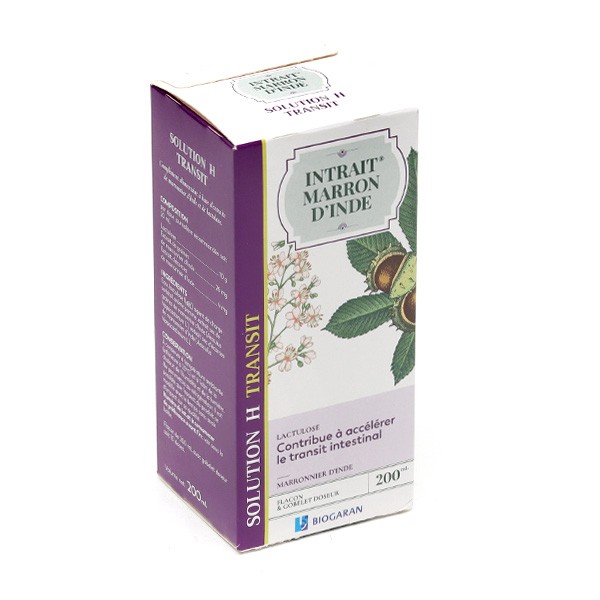 En cas de transit difficile, l'intrait de Marron d'Inde Solution H Transit est un produit 2 en 1 : il favorise le bon transit grâce au lactulose qui est un laxatif doux et en même temps, il renforce la tonicité des parois veineuses qui pourraient se transformer en hémorroïdes en cas de constipation grâce au Marron d'Inde. Le Marron d'Inde pour le confort pelvien