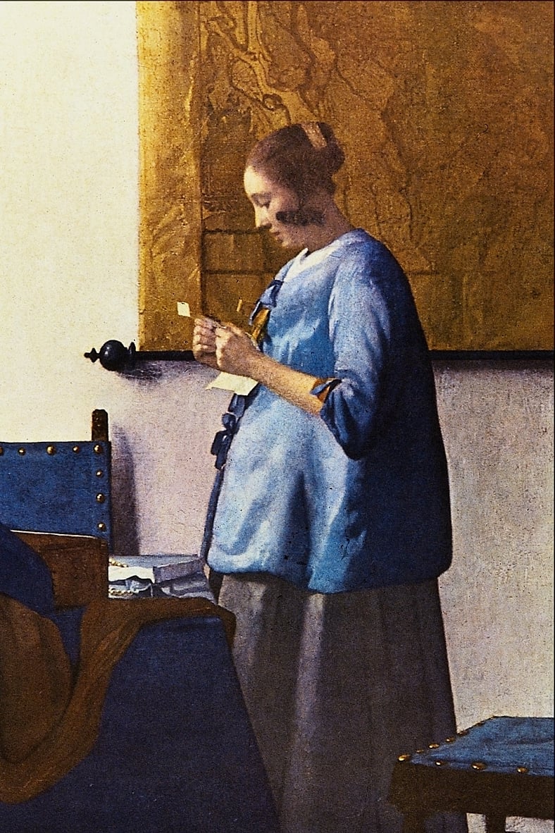 Woman Reading a Letter. In a quiet, private moment, a young woman stands, engrossed in reading a letter. It is morning, and she is still wearing her blue nightrobe. All the other colours are subordinate to its radiant lapis lazuli; yellow and red hardly make an appearance. Vermeer rendered the different effects of the cool light precisely.