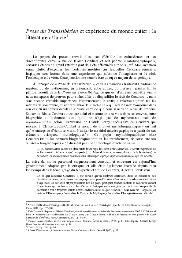 Notes. 1 Sur l'édition originale le poème présente deux titres différents : La Prose du Transsibérien et de la petite Jehanne de France (au-dessus des compositions de Sonia Delaunay) et Prose du Transsibérien et de la petite Jehanne de France (au-dessus du poème). À partir de 1919, c'est le second que garde Cendrars en remplaçant Jehanne par Jeanne.