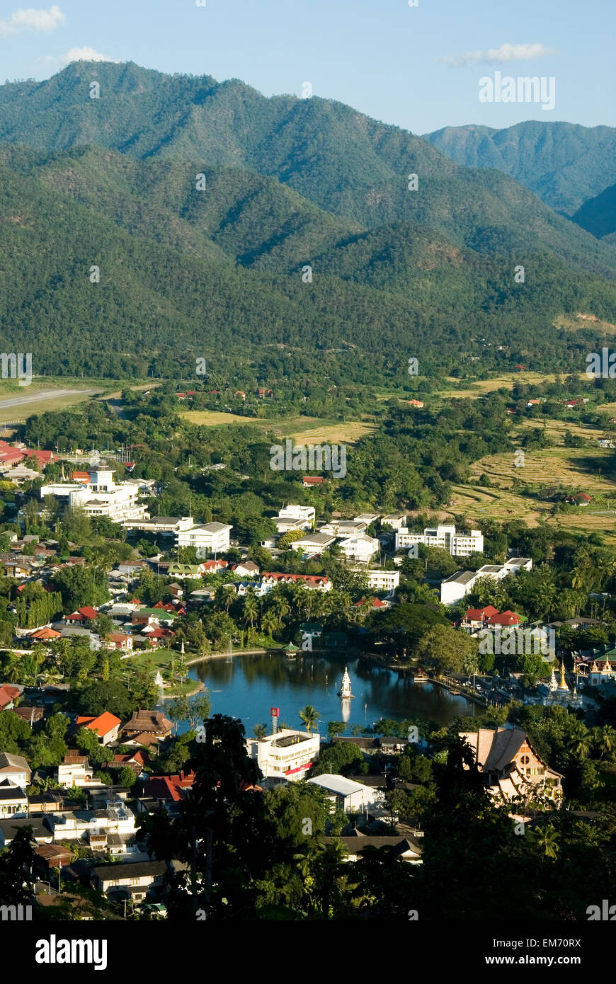 Thailand, Mae Hong Son Province, View from Wat overlooking Mae Hong Son; Wat Prathat Doi Kongmu