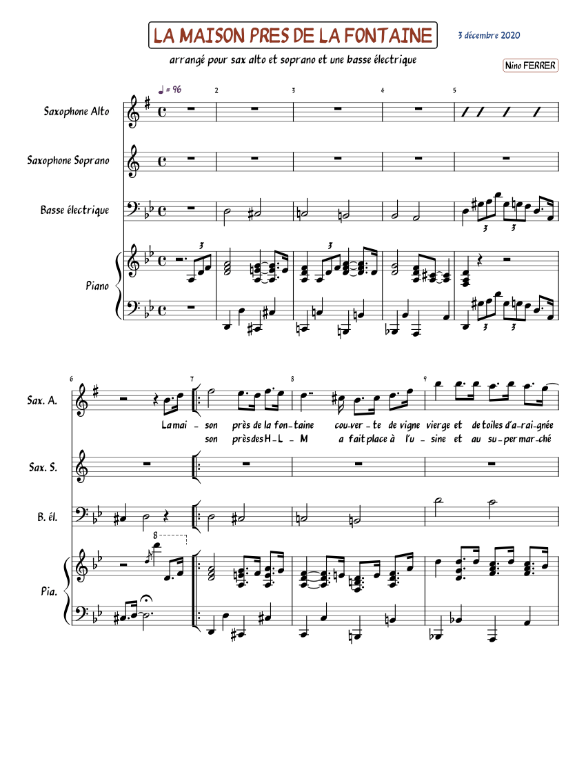 La_Maison_Pres_de_la_Fontaine_2Sax_Piano_Basse de Nino Ferrer Sheet music for Piano, Saxophone
