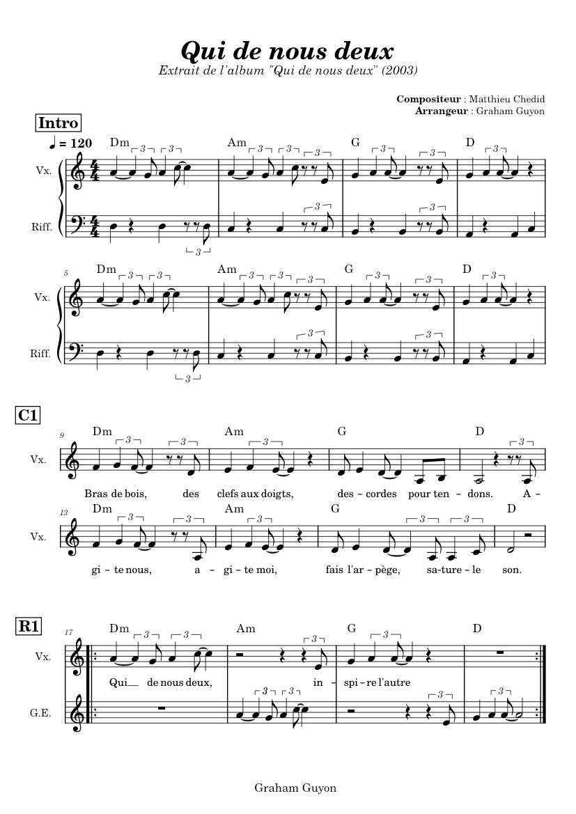 Paroles de la chanson Qui de nous deux ? par M (Matthieu Chedid) Bras de bois. Des clefs aux doigts. Des cordes pour tendons. Agite-nous. Agite-moi. Fais l'arpège. Sature le son. Qui de nous deux. Inspire l'autre. Oui je joue. D'un sixième membre. A la forme de tes hanches. Ventre à ventre. Elégante compagne. Qui de nous deux. Inspire l'autre.