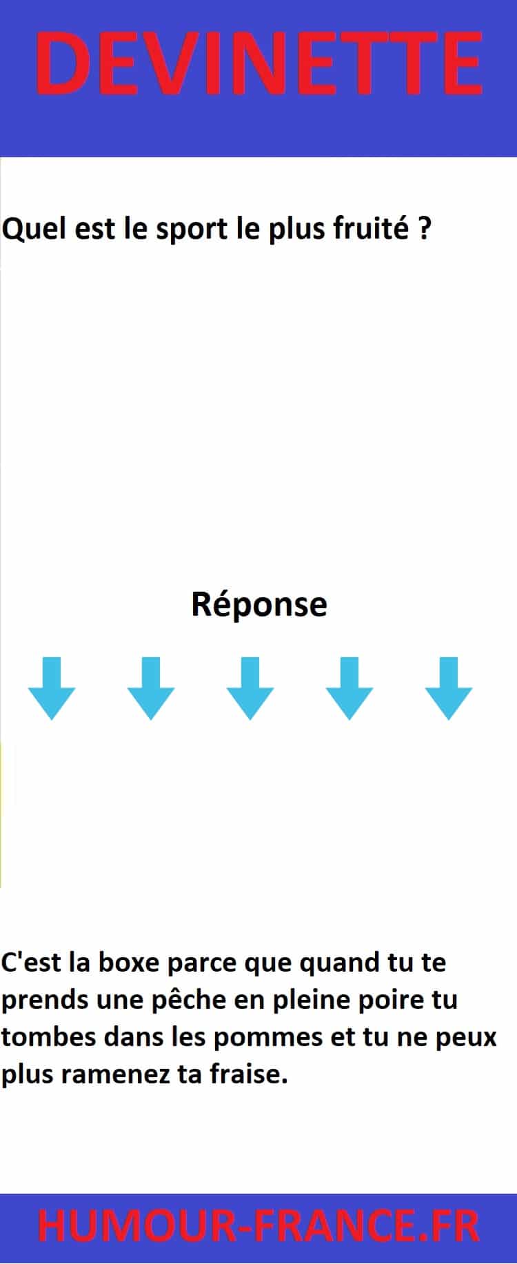 par blagues 6 mai 2010, 19:00 6.3k Views. Quel est le sport le plus fruité ? C'est la boxe parce que quand tu te prends une pêche en pleine poire tu tombes dans les pommes et tu peux plus ramenais ta fraise !!! 170.