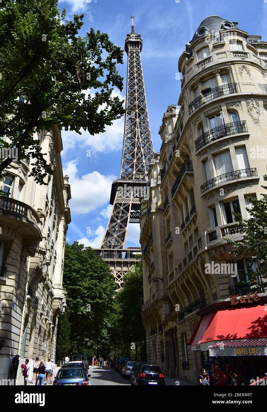 Parisian view of Tour Eiffel from Rue de Buenos Aires or Rue BuenosAyres. Paris, France. August