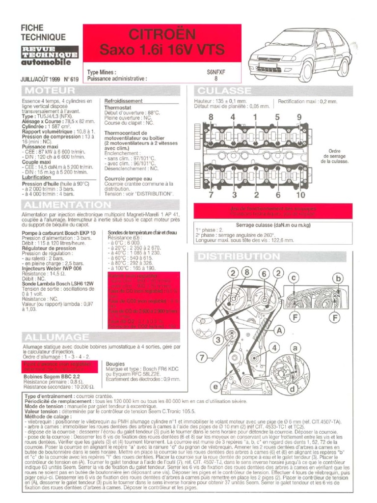 Moteur Citroën Saxo 1.6i 16v VTS (1996-2003) Type du moteur: 4 cylindres en ligne: Energie Essence: Disposition: Transversal avant: Alimentation Gestion intégrale Magnetti-Marelli: Suralimentation -Distribution Double arbre à cames en tête: Nombre de soupapes 4 par cylindre: Alésage & Course 78.5 x 82.0 mm: Cylindrée 1587 cc: Compression 10.8