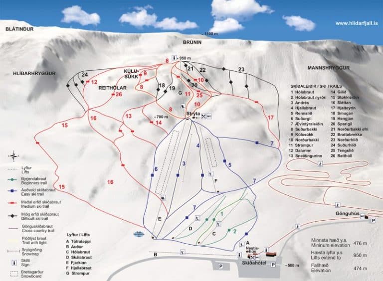 Akureyri La reine des stations de ski islandaises est Hlíðarfjall, qui possède des installations complètes, une école de ski, des pistes éclairées et des pistes de ski de fond. Grenivík Faites un tour en autoneige jusqu'à Kaldbakur (1 173 mètres), la plus longue piste de ski d'Islande puis redescendez en ski, en snowboard, en luge, à.